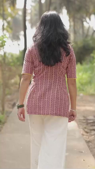 This stunning red kurti features a beautiful, traditional printed pattern in yellow and orange accents, giving it a vibrant yet sophisticated look. The V-neck design and three-quarter sleeves add a touch of elegance, while the yellow-trimmed edges enhance its stylish appeal. Paired effortlessly with white pants (not included), this kurti is ideal for casual outings, office wear, or festive occasions. Made from comfortable cotton fabric, it offers a flattering fit and breathable wear for all-day comfort. The outfit is complemented with matching silver accessories in the image, showcasing its versatile styling options